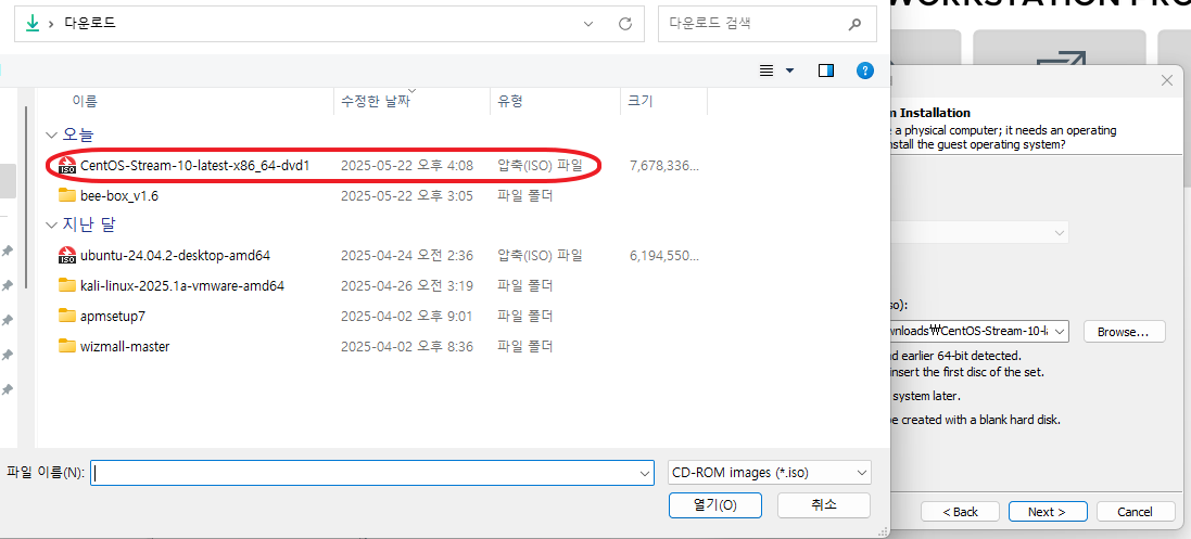 CentOS를 설치하고 받은 파일의 경로를 들어가서 ISO 파일을 선택해준다.