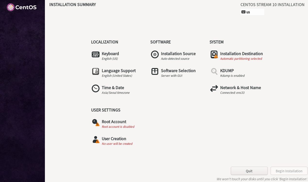 다 설치하면 CentOS 설정 화면이 뜨는데, ROOT 설정 등 구성을 설정할 수 있다.